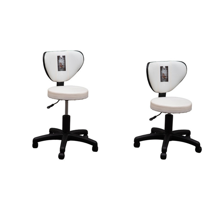 روکش این صندلی از جنس چرم با کیفیت با رنگبندی سفید و مشکی و طلایی می باشد. این صندلی جکدار با قابلیت تغییر ارتفاع تا 13 سانتی متر می باشد. صندلی تابوره چرخدار با قابلیت چرخش 360 درجه می باشد.